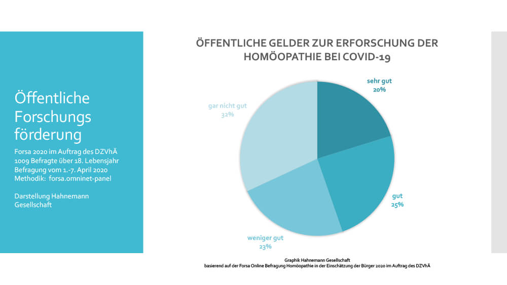 - 45% der Bürgerinnen und Bürger fänden es sehr gut bis gut, wenn für Homöopathie bei Covid-19 öffentliche Forschungsgelder zur Verfügung gestellt würden.